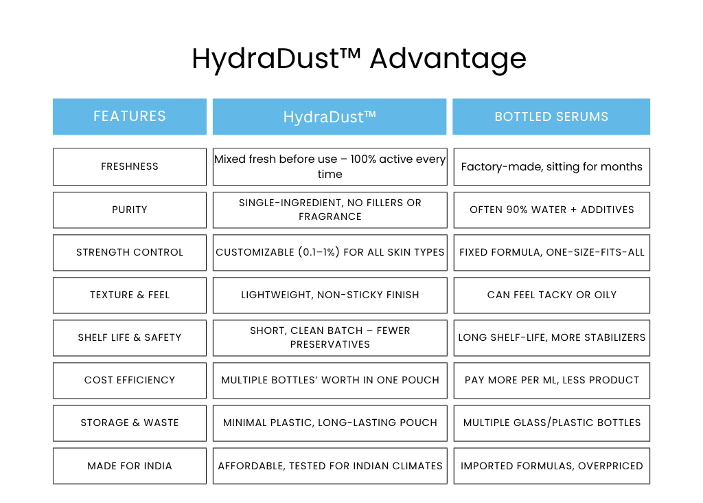 One HydraDust™ pack delivers more purity, longevity, and value than bottled serums — without waste.