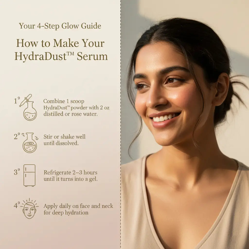 With just Water and Time, HydraDust™ transforms into a fresh hyaluronic serum that locks in moisture naturally No Fillers, No Fuss.