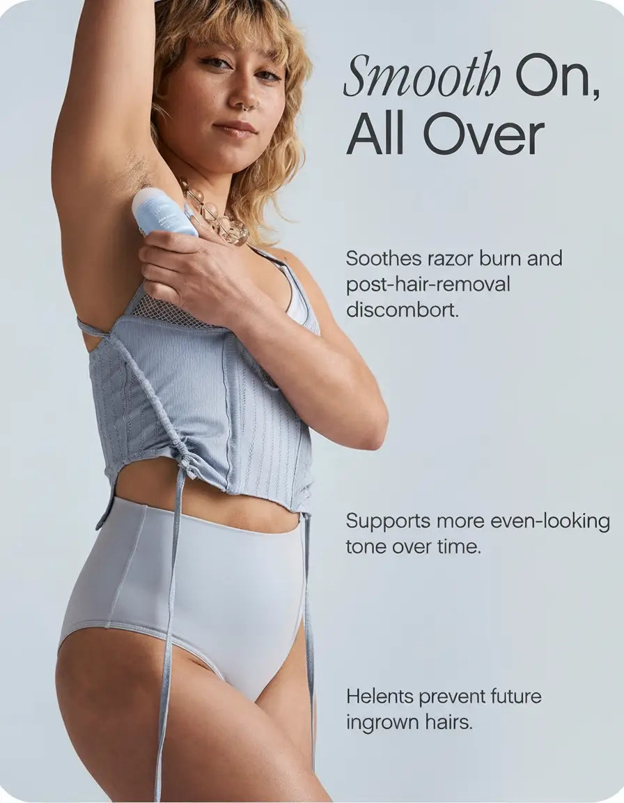 Post-shave or post-wax, our hygienic roll-on pairs gentle exfoliants with soothing botanicals to calm razor burn, help prevent ingrowns, and support more even-looking tone across underarms, bikini line, legs, neck, and face.