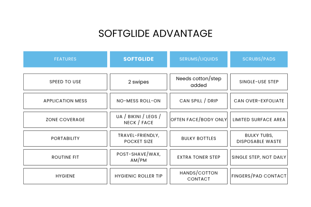 With Regular use, SoftGlide helps calm bumps, prevent ingrowns, and support faster-looking recovery - clean, targeted, no-mess roll-on care for every zone.