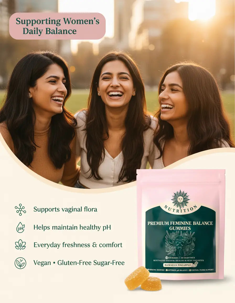 Our gummies combine clinically studied probiotics and natural fruit extracts that help restore vaginal flora, rebalance pH levels, and reduce odor, itching, and discomfort—so you feel fresh and confident every day.