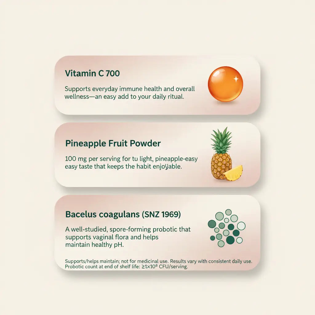 - Bacillus coagulans (SNZ 1969) — A robust, spore-forming probiotic that supports vaginal flora and helps maintain healthy pH, backing everyday freshness and comfort.