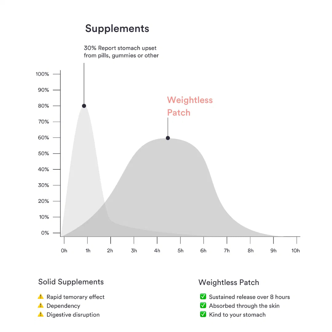 Patches have been shown to be more effective than supplements due to their extended release technology, which provides a steady, consistent delivery of ingredients over time, offering longer-lasting hunger management.